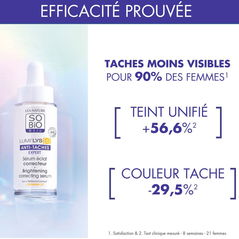 Découvrez LUMI’LYS [C], la nouvelle gamme experte anti-taches de SO’BiO étic, spécialement conçue pour unifier le teint et réduire visiblement l’apparence des taches. Que ce soit des taches liées à l’âge, au soleil, à l’acné ou au mélasma, LUMI’LYS [C] agit avec efficacité grâce à une formule naturelle, testée cliniquement pour des résultats visibles dès 4 semaines.