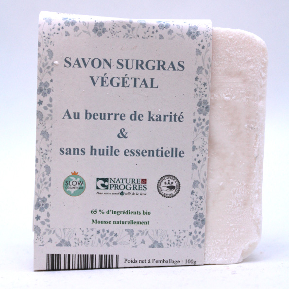 Savon surgras saponifié à froid vegan. Il contient du beurre de karité ce qui lui permet d’être nourrissant. De plus, il nettoie la peau en douceur sans la dessecher. Sans huile essentielle, il peut être utilisé par toute la famille. Si vous avez les mains sèches, gercées, utilisez le, suivis d’une bonne crème pour les mains ! Vous pouvez l’utiliser pour le visage, le corps et les mains. Mais évitez le contact avec les yeux. Il ne contient pas d’huile de palme, de colorant, de parfum et de conservateur. Ingrédients : sodium rapeseedate*, sodium olivate*, sodium cocoate*, glycerin, aqua, sodium sheabutterate*. *Ingrédients issus de l’agriculture biologique. ** Composés naturellement présents dans les huiles essentielles. 65% du total des ingrédients sont issus de l’Agriculture Biologique
